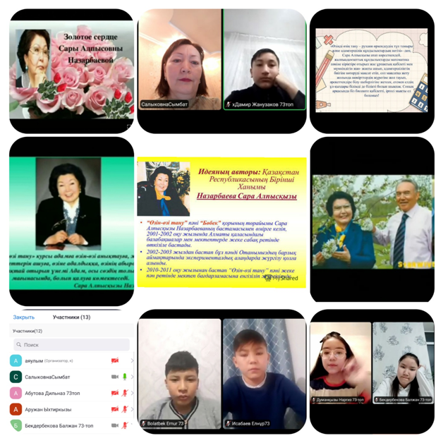 «Мейірім төгетін ана" атты бейнеролик көрсетілді. Мақсаты: «Өзін-өзі тану» адамгершілік-рухани білім беру бағдарламасының авторы Сара Алпысқызы Назарбаева өмір жолы , жалпы адамзаттық рухани құндылықтарға бастайтын қайырымдылық іс шаралары, еліміздегі қ адамгершілік-рухани білім беруінің дамуына қосқан өлшеусіз үлесі туралы таныстыру. Жасөспірімдерді мейірімділікке тәрбиелеу, өзара түсіністік пен сыйластықты сақтау деген қағиданы түсіндіру.