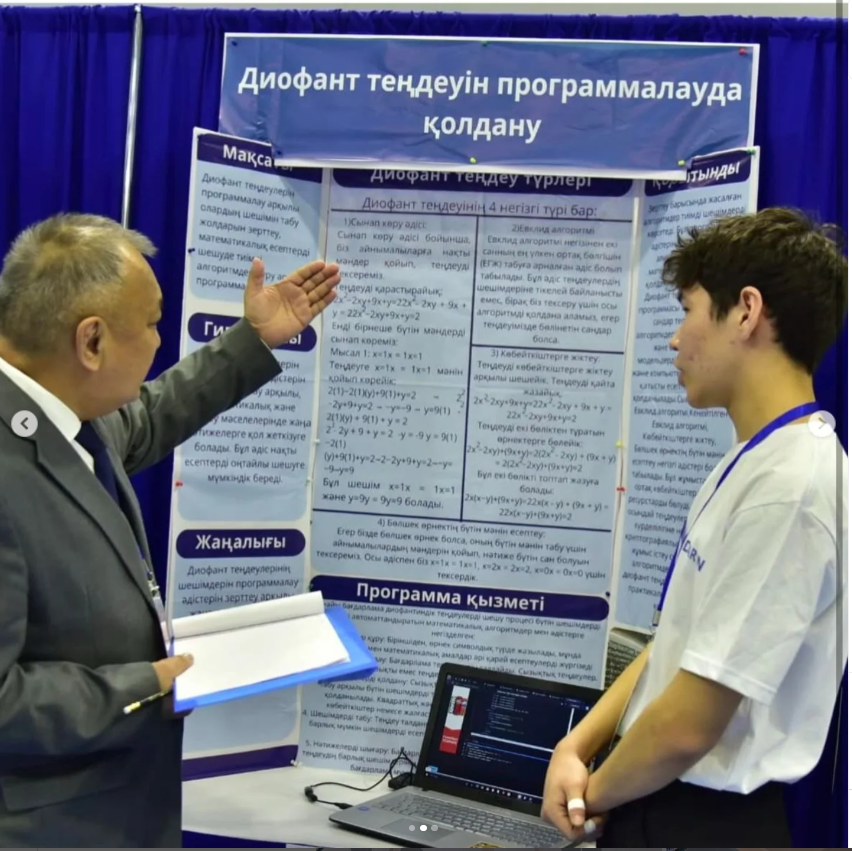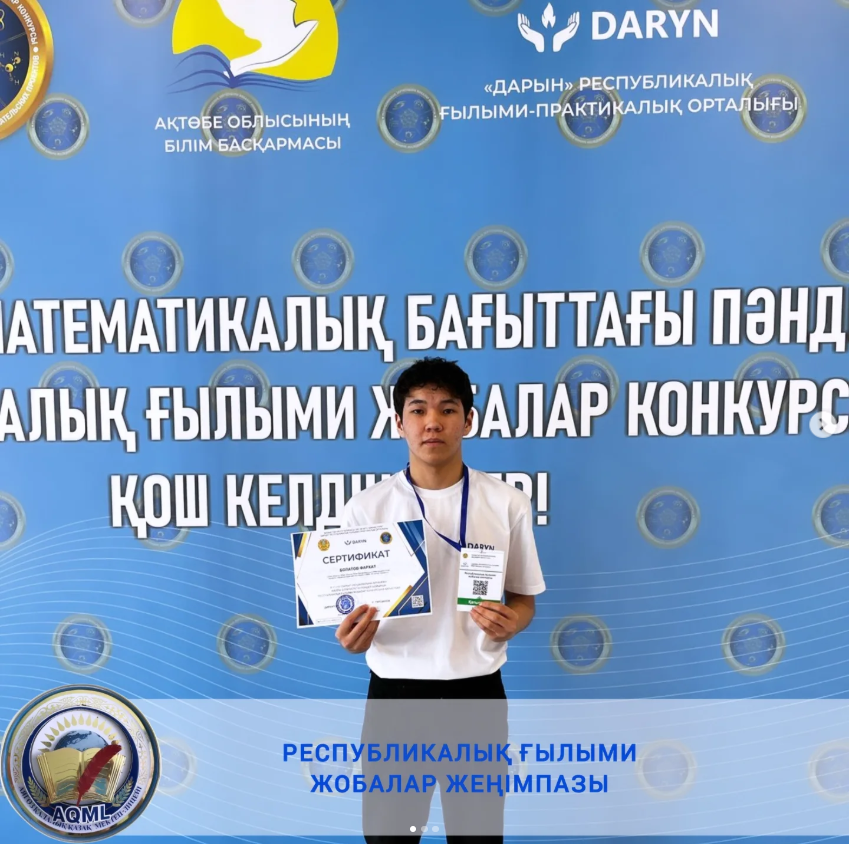 ✔️ “Қалалық қазақ мектеп-лицейі” КММ-нің 10 сынып оқушысы БОЛАТОВ ФАРХАТ МАРАТҰЛЫ “математика” секциясы бойынша қатысып,
