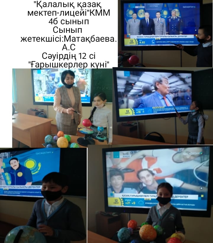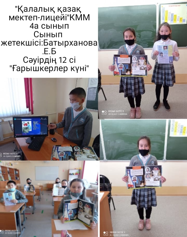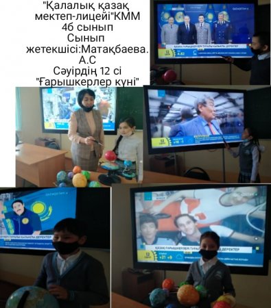 12-сәуір "Ғарышкерлер күніне" байланысты "Қалалық қазақ мектеп-лицейі" КММ-де тәрбие сағаттар өтілді. Онда осы ғарышқа байланысты жас ерекшеліктеріне сай ақпараттар берілді.