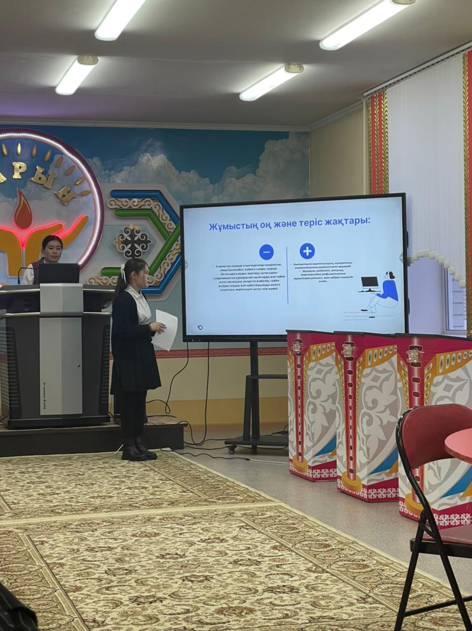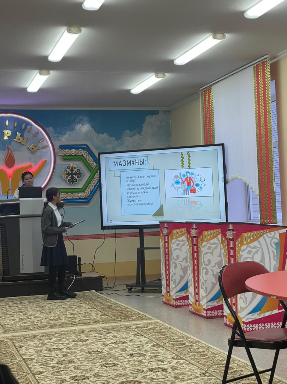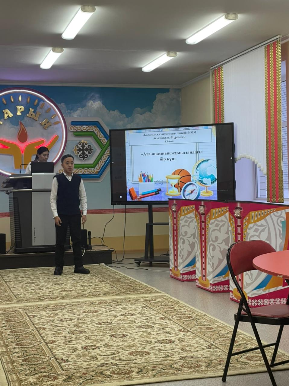 1 желтоқсан күні «Қалалық қазақ мектеп-лицейі» КММ-нде педагог- кәсіби бағдар беруші Ақнұр Қаблашқызының ұйымдастыруымен «Ата- анамның жұмыс орнындағы 1 күн» атты жобалық жұмыс байқауы өтті. Мақсаты: Оқушыларды мамандық тандауға бағыттау, нақтылыққа бейімдеу, ата-аналарын құрметтеу, еңбектерін бағалау; Байқаудың қорытындысы бойынша: