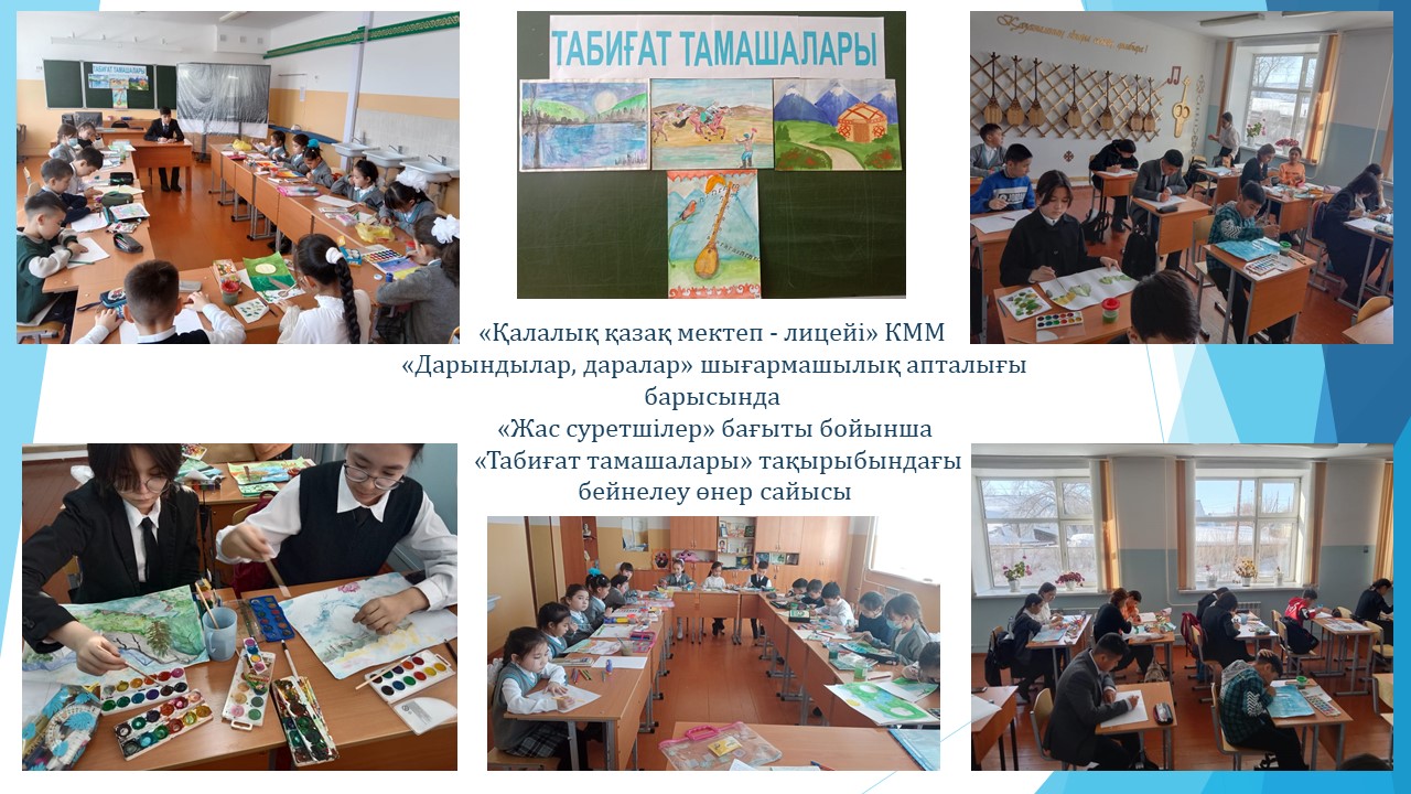 13.02.2023 күні дәстүрлі "Дарындылар-даралар" шығармашылық апталығы аясында 1-10 кластар арасында"Табиғат тамашалары" тақырыбында мектепішілік суреттер байқауы өтті.