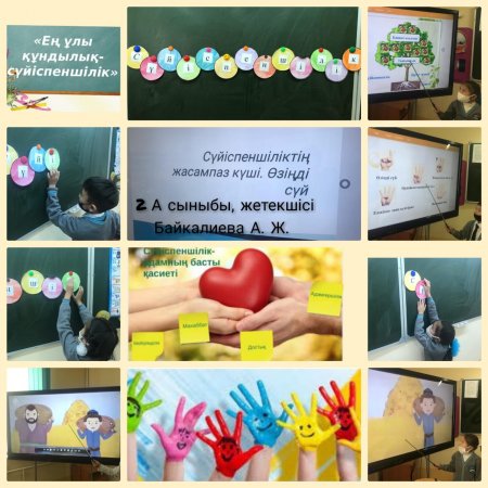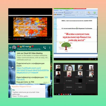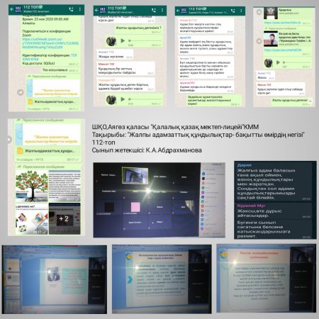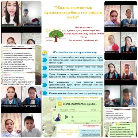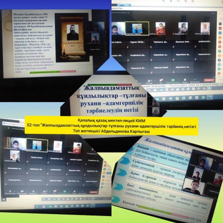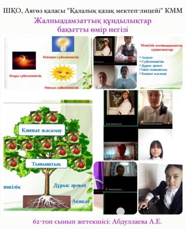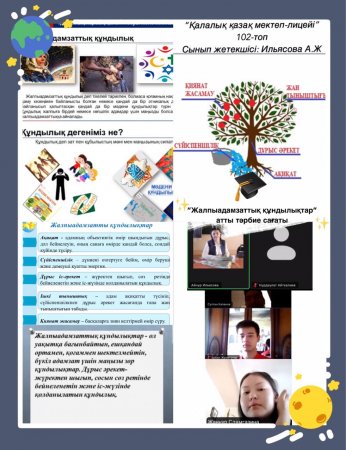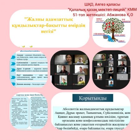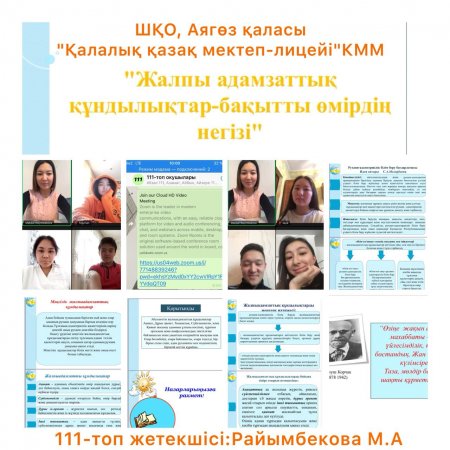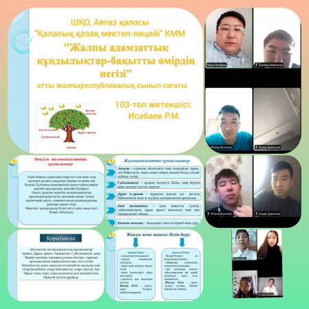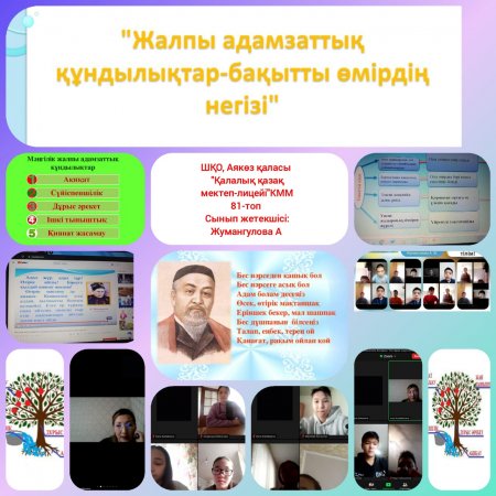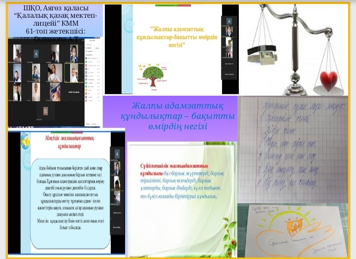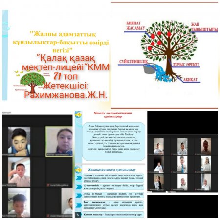 2020 жылы 23 қарашада сағат 9.00-де "Жалпыадамзаттық құндылықтар күніне орайластырылған заттық құндылықтар-бақытты өмір негізі" тақырыбында "қалалық қазақ мектеп-лицейі" КММ-нің барлық оқушыларына жалпы республикалық бірыңғай өзін-өзі тану сағаты өтті