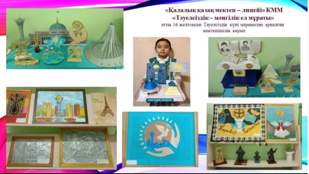 15.12.2023 ж. "Тәуелсіздік-мәңгілік ел мұраты" тақырыбында көркем еңбек пәні мұғалімдерінің ұйымдастыруымен 1-8 сынып оқушылары арасында қолөнері көрмесі ұйымдастырылды.
