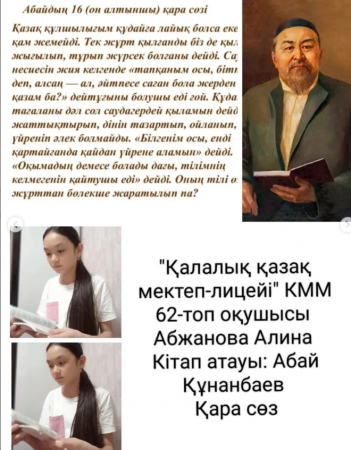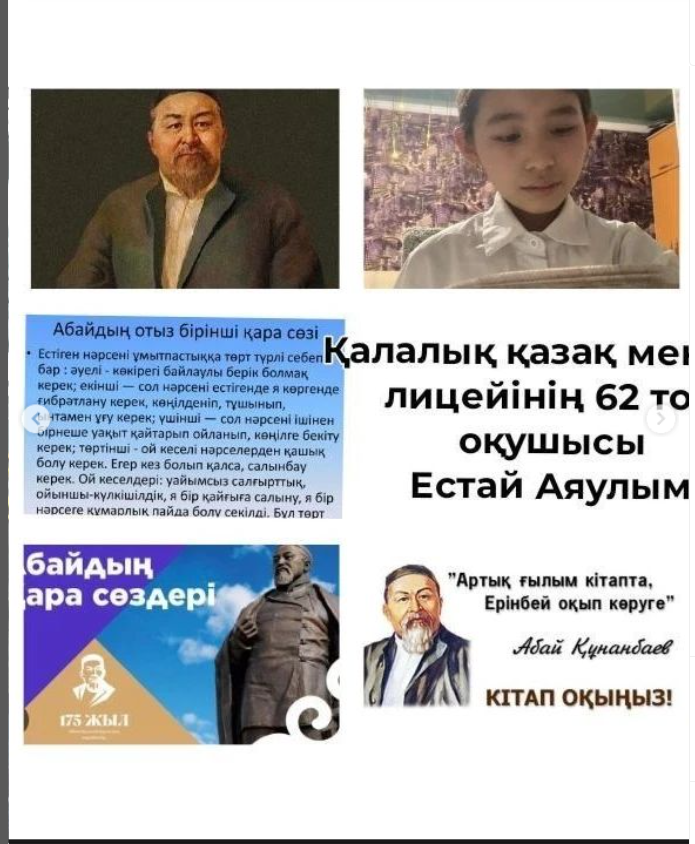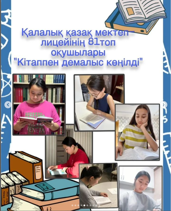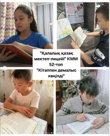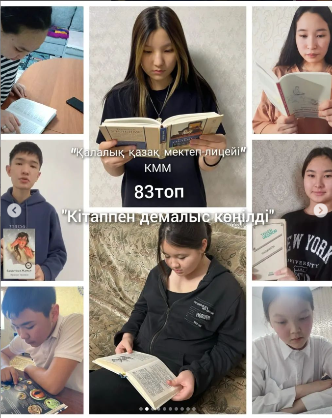 Қысқы демалысқа арналған іс-шаралар жоспары аясында оқушылардың каникул кезіндегі бос уақытын тиімді өткізуді ұйымдастыру , дүниетанымын кеңейту , күнделікті кітап оқуға тарту мақсатымен "Қалалық қазақ мектеп-лицейі" КММ кітапханасында 5-9 сыныптар арасында "Кітаппен демалыс көңілді" фотоколлаж сайысы өткізілді. Сайыс нәтижесі бойынша Бас жүлде - 62топ , I орын - 81топ , II орын - 52топ , III орын - 82 және 83 топтар иеленді#оқуға_құштармыз