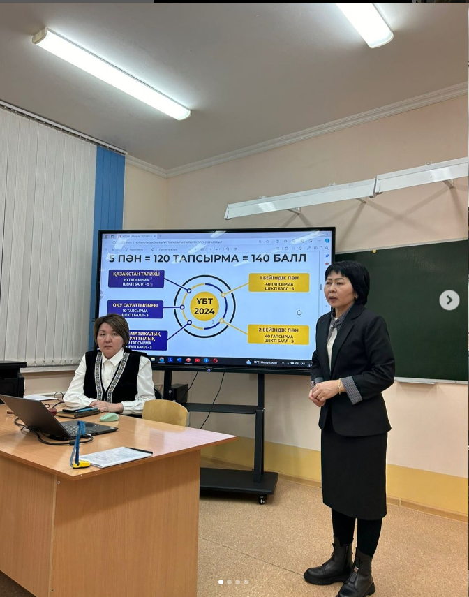 ДОІЖО А.М.Нуркамбаева 11- сынып оқушылары үшін маңызды міндет – ҰБТ-ға дайындық, оны тапсыру болып табылатындығын және жасөспірімдердің тыныштығы, сенімділігі, психологиялық тұрақтылығының ресурсы ең алдымен олардың ата-анасына байланысты екендігіне тоқталды. 2024 жылғы ҰБТ- ның форматымен ата -аналарды таныстырып өтті.Әрбір ата-ана түсінуі тиіс: ҰБТ нәтижесінің маңыздылығы олардың баланың денсаулығы мен эмоционалдық саулығына алаңдаушылығынан басым болмауы керектігі ескертілді. ҰБТ-ның өткізілу тәртібімен таныстыра отырып, жан-жақты мағлұмат берілді.
