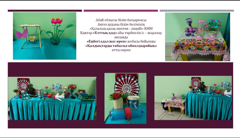 Абай облысы білім басқармасы Аягөз ауданы білім бөлімінің "Қалалық қазақ мектеп-лицейі"КММ 19.01.2024 ж "Еңбегі адал жас өрен" жобасы аясында "Қалдықтарды табысқа айналдырайық" тақырыбында 2-9-сынып оқушылары арасында қолөнері көрмесі ұйымдастырылды.