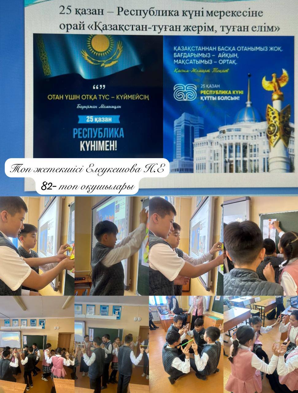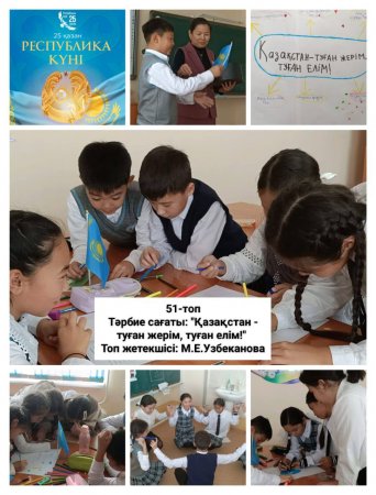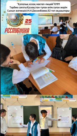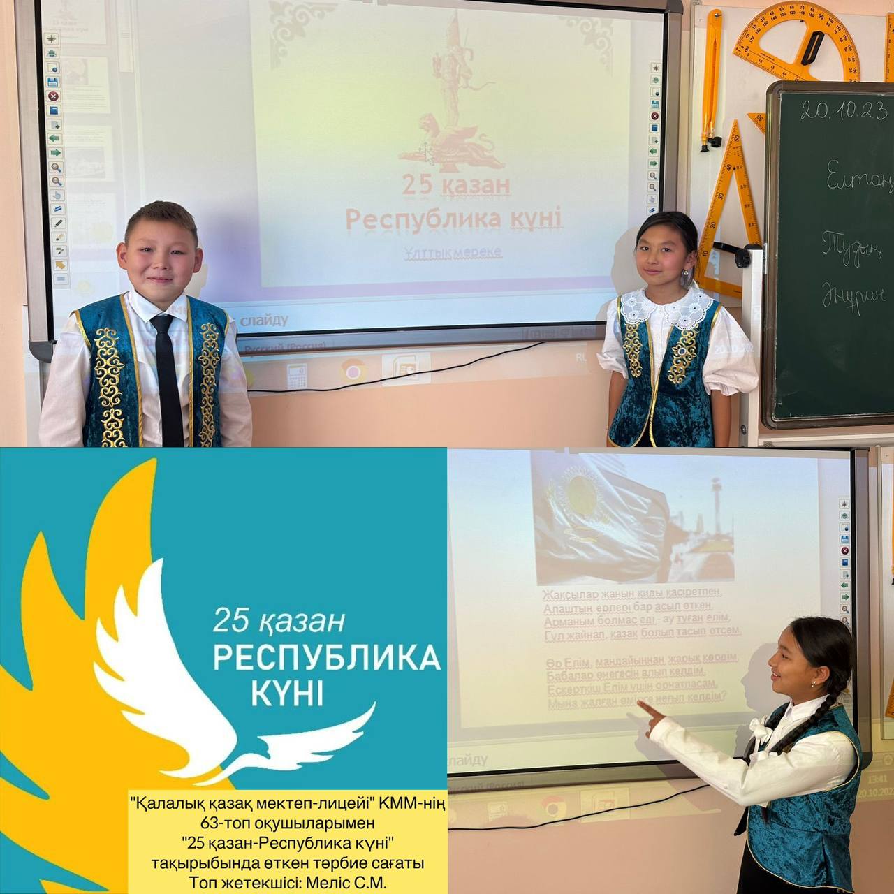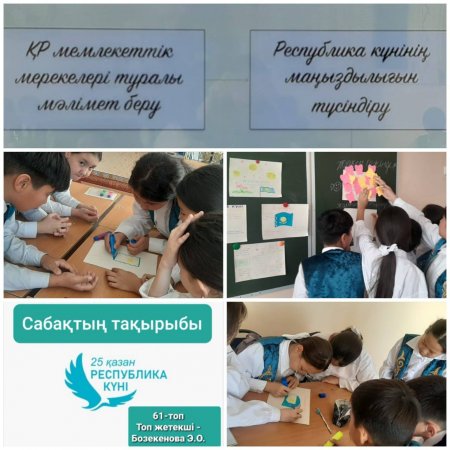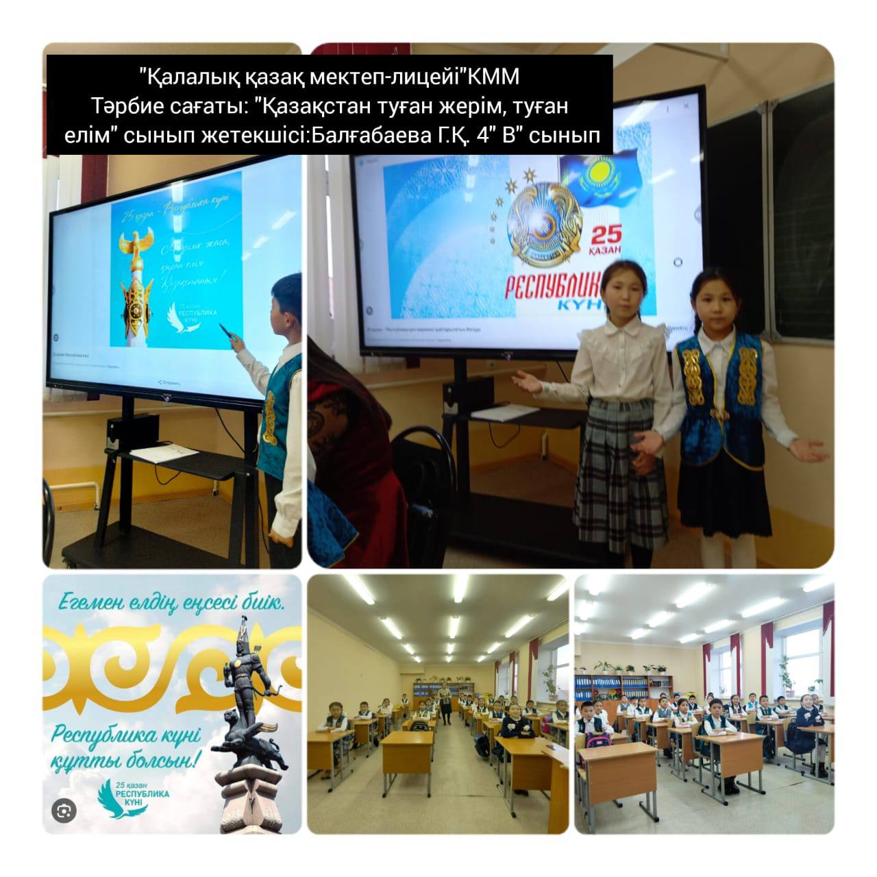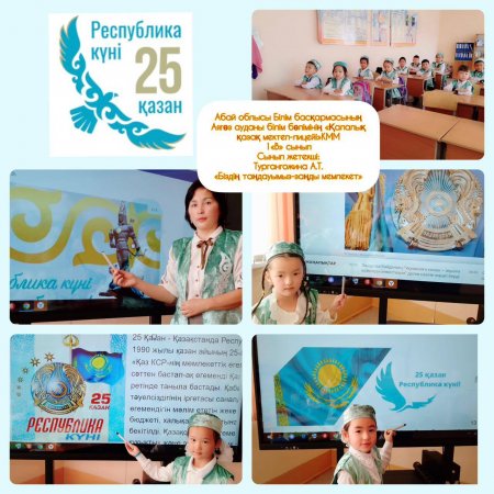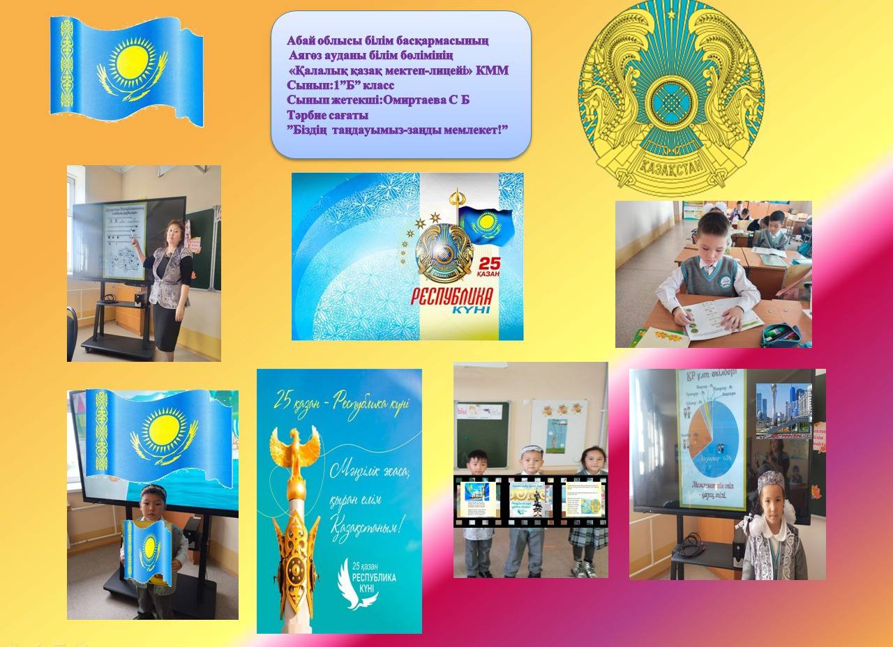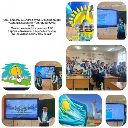 Абай облысы білім басқармасы Аягөз ауданы білім бөлімінің “Қалалық қазақ мектеп-лицейі” КММ-де 25 қазан - Республика күніне орай “Біздің таңдауымыз-Заңды мемлекет” тақырыбында тәрбие сағаттары өткізілді. Мақсаты: Оқушыларды өз Отанын сүюге, қазақ екенін, Қазақстанда тұратынын мақтаныш етуге, туған халқының тілін, мәдениетін, салт – дәстүрін қастерлейтін саналы да парасаты азаматтар тәрбиелеу. #oqu_agartu_ministrligi #абайоблысыбілімбасқармасы #республикакүні