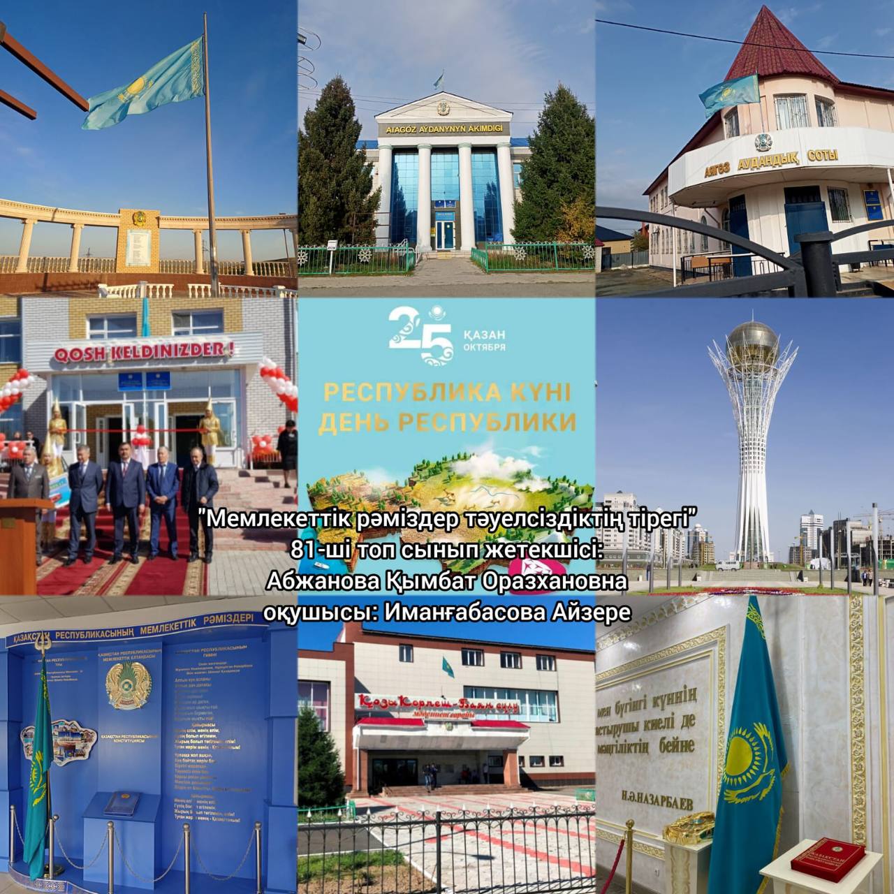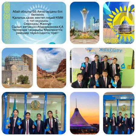 Абай облысы білім басқармасы Аягөз ауданы білім бөлімінің "Қалалық қазақ мектеп-лицейі" КММ-де 25 қазан - Республика күніне орай "Мемлекеттік Рәміздер-Тәуелсіздіктің тірегі" тақырыбында 7-8-сыныптар арасында челлендж ұйымдастырылды. Мақсаты: Балалардың рухани-адамгершілік және патриоттық тәрбиесін қалыптастыра отырып, шығармашылық дарынын шыңдау. #oqu_agartu_ministrligi #абайоблысыбілімбасқармасы #менелімменмақтанамын