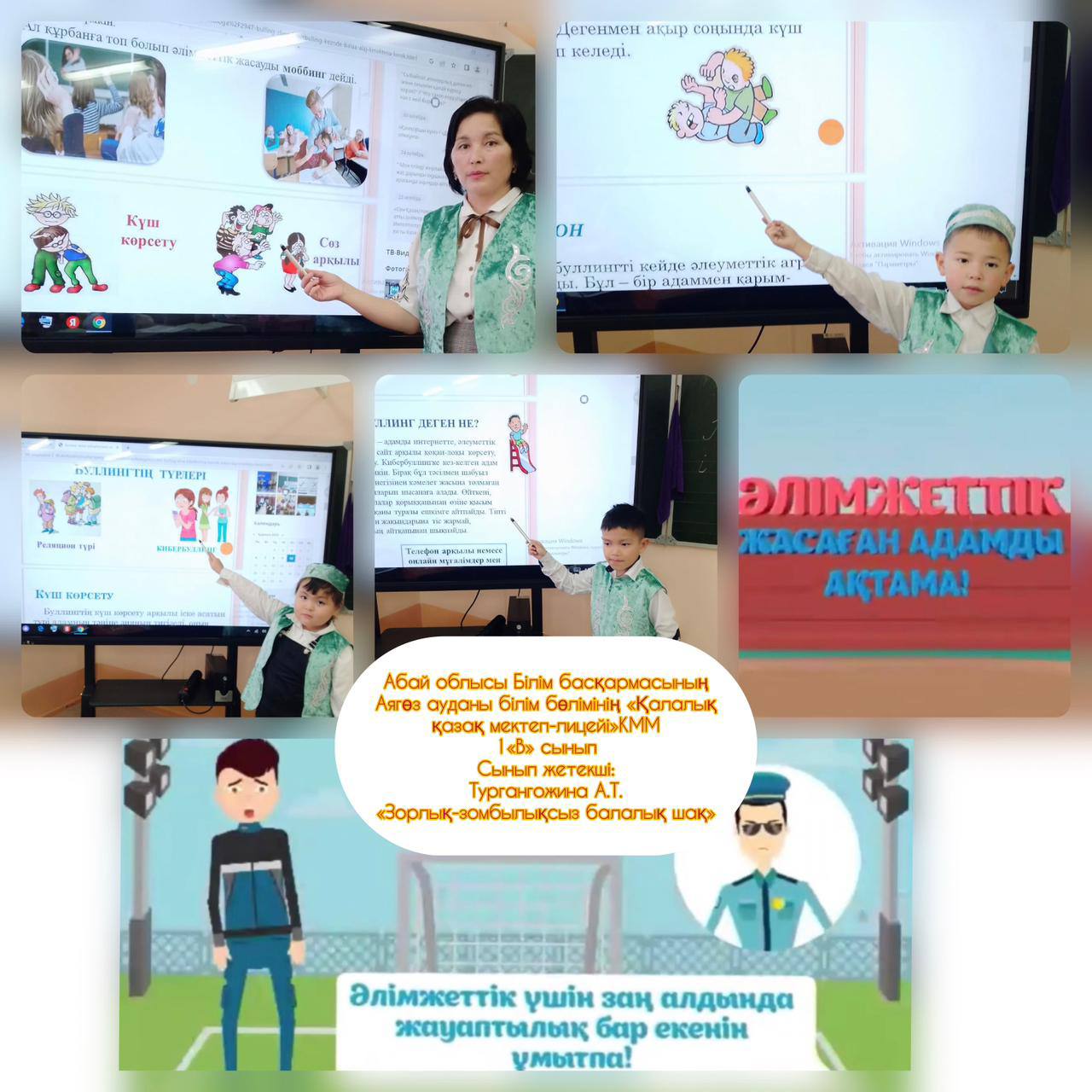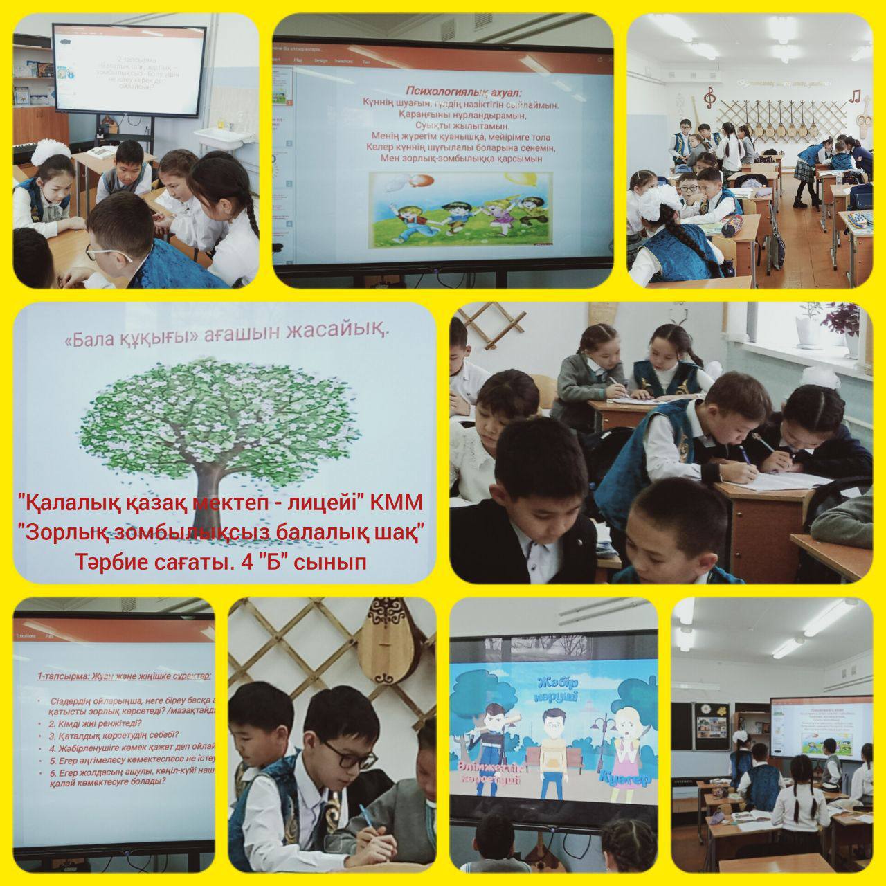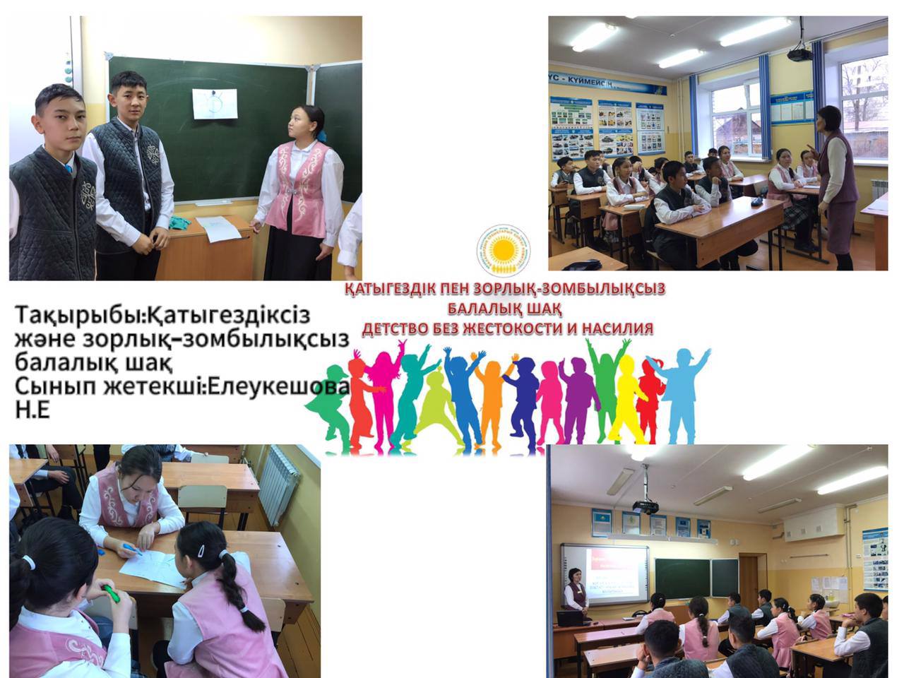 Абай облысы білім басқармасы Аягөз ауданы білім бөлімінің "Қалалық қазақ мектеп-лицейі" КММ-де 8-20 қараша аралығында "Қатыгездіксіз және зорлық-зомбылықсыз балалық шақ" ақпараттық науқанын өткізу жөніндегі іс-шаралар жоспары аясында 1-11 сынып оқушылары арасында «Зорлық-зомбылықсыз балалық шақ» тақырыбында тәрбие сағаттары өткізілді. Мақсаты: Балаларға зорлық-зомбылық туралы мағлұмат беру, адамның жаны мен тәніне үлкен зардап әкелетін соққы екенін түсіндіру және зорлыққа қарсы біздің елімізде заң бар екенін айту. Балаларға өз жүрген орталарында мейірімді болуға, бұзақылық істерге бармауға, адами бойларындағы қасиеттерін сақтауға, әдепті де, тәртіпті тұлға болып өсуіне тәрбиелеу.