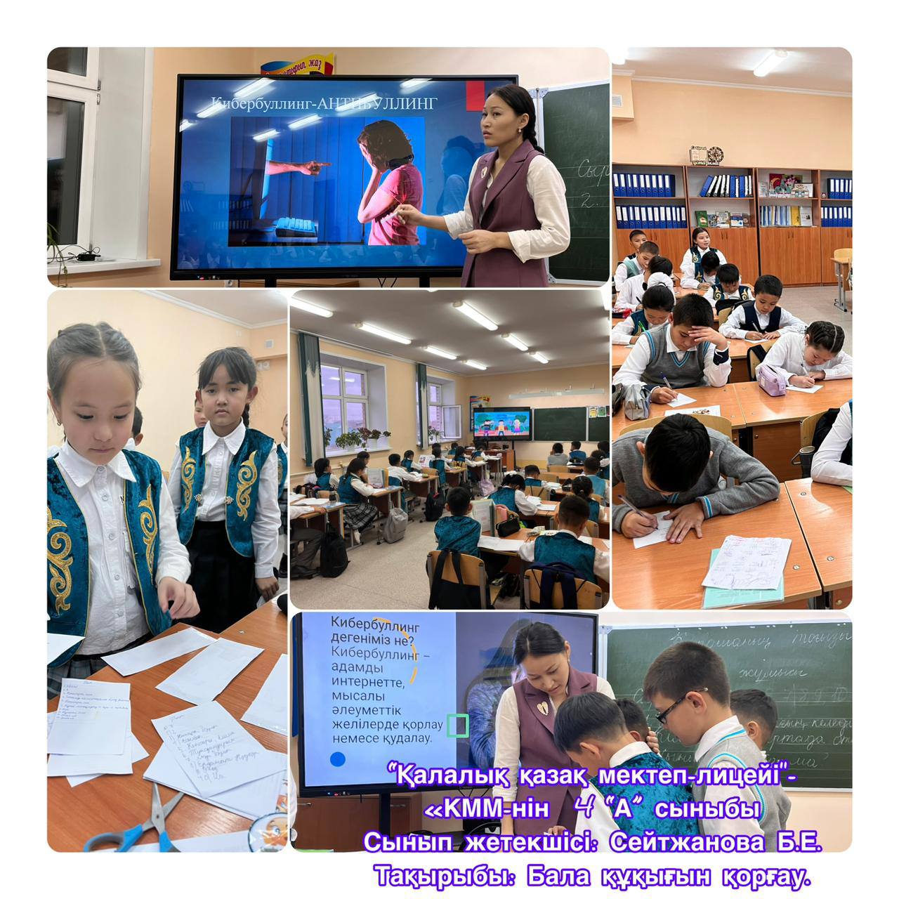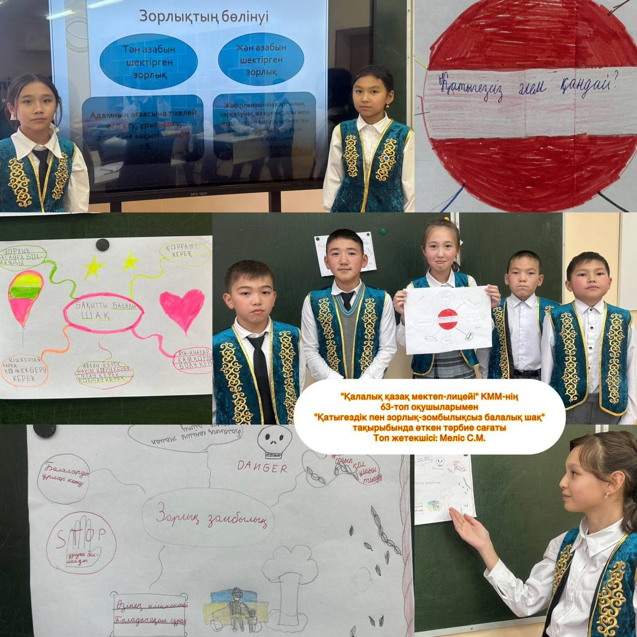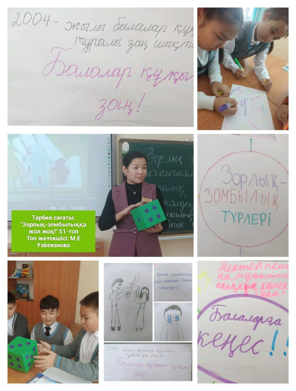 Абай облысы білім басқармасы Аягөз ауданы білім бөлімінің "Қалалық қазақ мектеп-лицейі" КММ-де 8-20 қараша аралығында "Қатыгездіксіз және зорлық-зомбылықсыз балалық шақ" ақпараттық науқанын өткізу жөніндегі іс-шаралар жоспары аясында 1-11 сынып оқушылары арасында «Зорлық-зомбылықсыз балалық шақ» тақырыбында тәрбие сағаттары өткізілді. Мақсаты: Балаларға зорлық-зомбылық туралы мағлұмат беру, адамның жаны мен тәніне үлкен зардап әкелетін соққы екенін түсіндіру және зорлыққа қарсы біздің елімізде заң бар екенін айту. Балаларға өз жүрген орталарында мейірімді болуға, бұзақылық істерге бармауға, адами бойларындағы қасиеттерін сақтауға, әдепті де, тәртіпті тұлға болып өсуіне тәрбиелеу.