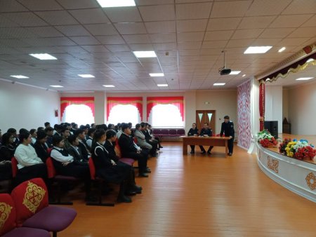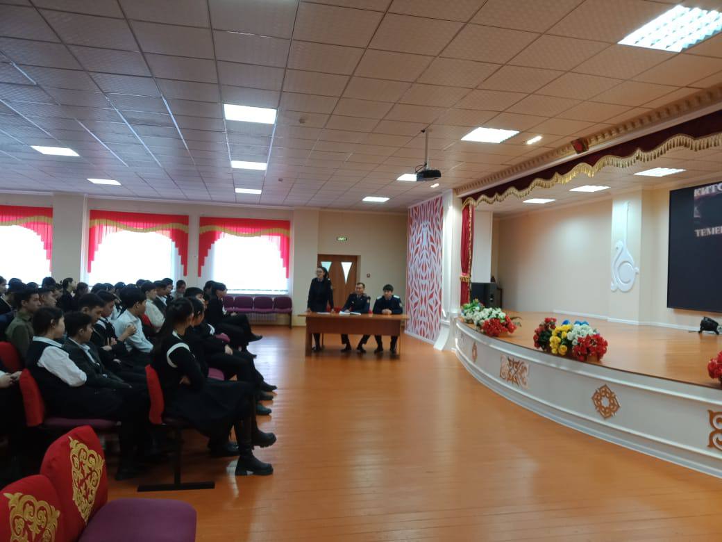 0-11 сынып оқушыларымен бірге құқық бұзушылықтың алдын алу, нашақорлық, жол көлік жарақаттануы, қауіпсіз мінез-құлық, дағдарыс жағдайындағы іс-әрекеттердің алдын алу мақсатында полиция қызметкерлерімен кездесу