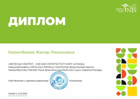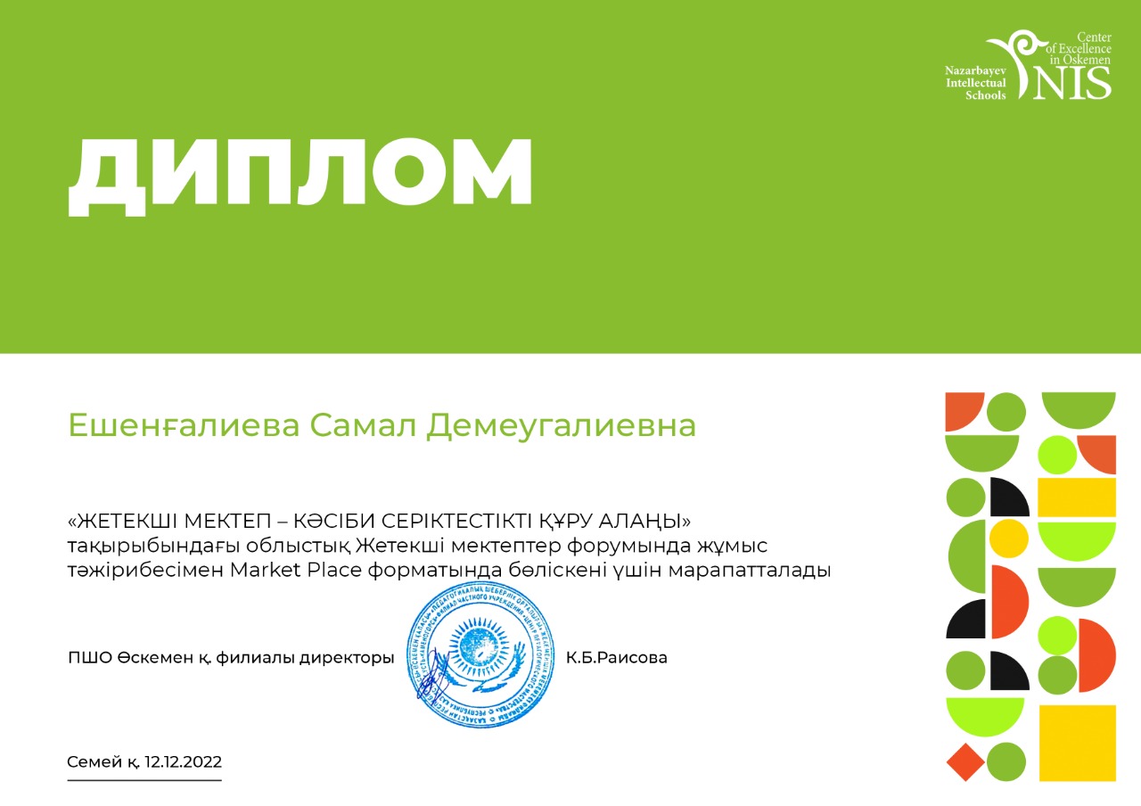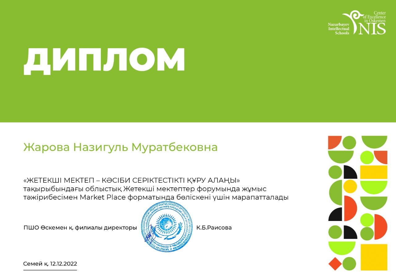 2022 жылдың 12 желтоқсанында Абай облысының Білім басқармасы Облыстық инновациялық – әдістемелік орталығы және педагогикалық шеберлігі орталығы мен Назарбаев зияткерлік мектебінің ұйымдастыруымен «Жетекші мектеп-кәсіби серіктестікті құру алаңы» тақырыбында облыстық форум өткізілді. Форумның мақсаты: облыстық жетекші мектеп мұғалімдерінің кәсіби дамуын қолдау және озық педагогикалық тәжірибені таныстыру үшін ұйымдастырушылық-әдістемелік жағдай жасау болып табылады. Форум аясында Семей қаласы физика-математика бағытындағы Назарбаев Зияткерлік мектептері мұғалімдерінің әдістемелік қолдауы алаңы, дөңгелек үстел, Market Place, PITCH-SESSION ұйымдастырылды. Форумға Абай облысы білім басқармасының Аягөз ауданы білім бөлімінің «Қалалық қазақ мектеп-лицейі» КММ директоры Жарова Назигуль Муратбековна, директордың оқу-тәрбие ісі жөніндегі орынбасарлары Анкебаева Асем Маркаленовна, Ешенгалиева Самал Демеугалиевна, Узбеканова Меруерт Еркиновна, директордың ғылыми істер жөніндегі орынбасары Керимбаева Жанар Рахымовна, директордың тәрбие ісі жөніндегі орынбасары Нуркамбаева Акерке Мураткажиевна «Серіктес мектеп ретінде жетекші мектептермен жұмыс» тақырыбында Market place форматында өз тәжірибелерімен бөлісіп, педагогикалық шеберлік орталығы Өскемен қаласы филиалы директорының дипломымен марапатталды.