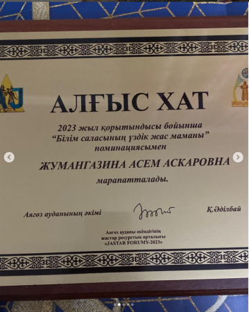 2023 жылдың қорытындысы бойынша ауданымызда әр саланың үздіктері анықталды. Жылдың “Үздік жас ұстазы” аталымын “Қалалық қазақ мектеп-лицейі” КММ-нің биология пәні мұғалімі Жумангазина Асем Аскаровна иеленіп аудан әкімінің алғыс хатымен марапатталды. Құттықтаймыз💐💐💐