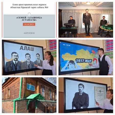 Абай облысы білім басқармасы Аягөз ауданы білім бөлімінің "Қалалық қазақ мектеп-лицейі" КММ-де Облыстық инновациялық - әдістемелік орталығы ҚР Президенті Қ.Ж.Тоқаевтың 05.01.2021 жылы "Егемен Қазақстан" газетінде жарияланған "Тәуелсіздік бәрінен қымбат" мақаласы аясында айтылған тапсырмалар тізбесінің 2-тармағын орындау және Алаш арыстарының асыл мұрасын игеруді жалғастыру мақсатында 19.10.2023 жылы 101-топ оқушыларымен "Семей-Алашорда астанасы" атты бірыңғай тарих сабағы өткізілді. Өткізген тарих пәні мұғалімі: Рашитова Ұлжан Рашитқызы. Мақсаты: Алаш Орда үкіметі, Алаш зиялылары туралы мәліметтер және Алаш Орданың астанасы болған тарихқа толы Семей қаласы туралы баяндау.