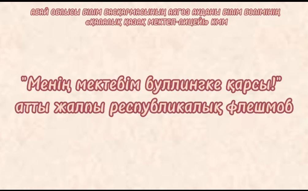 Абай облысы білім басқармасы Аягөз ауданы білім бөлімі "Қалалық қазақ мектеп-лицейі"КММ-де 19.05.2023 "Менің мектебім буллингке қарсы!" атты флешмоб ұйымдастырылды. Мақсаты:қоғам назарын балалардың қауіпсіздік мәселелеріне деген саналы көзқарасына аудару. Оқушылардың буллингке қарсы санасы мен ойлауын қалыптастыру.