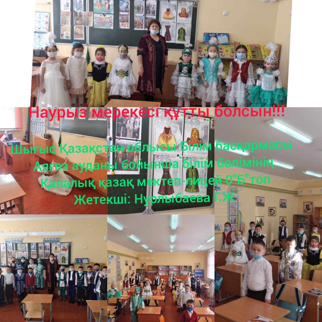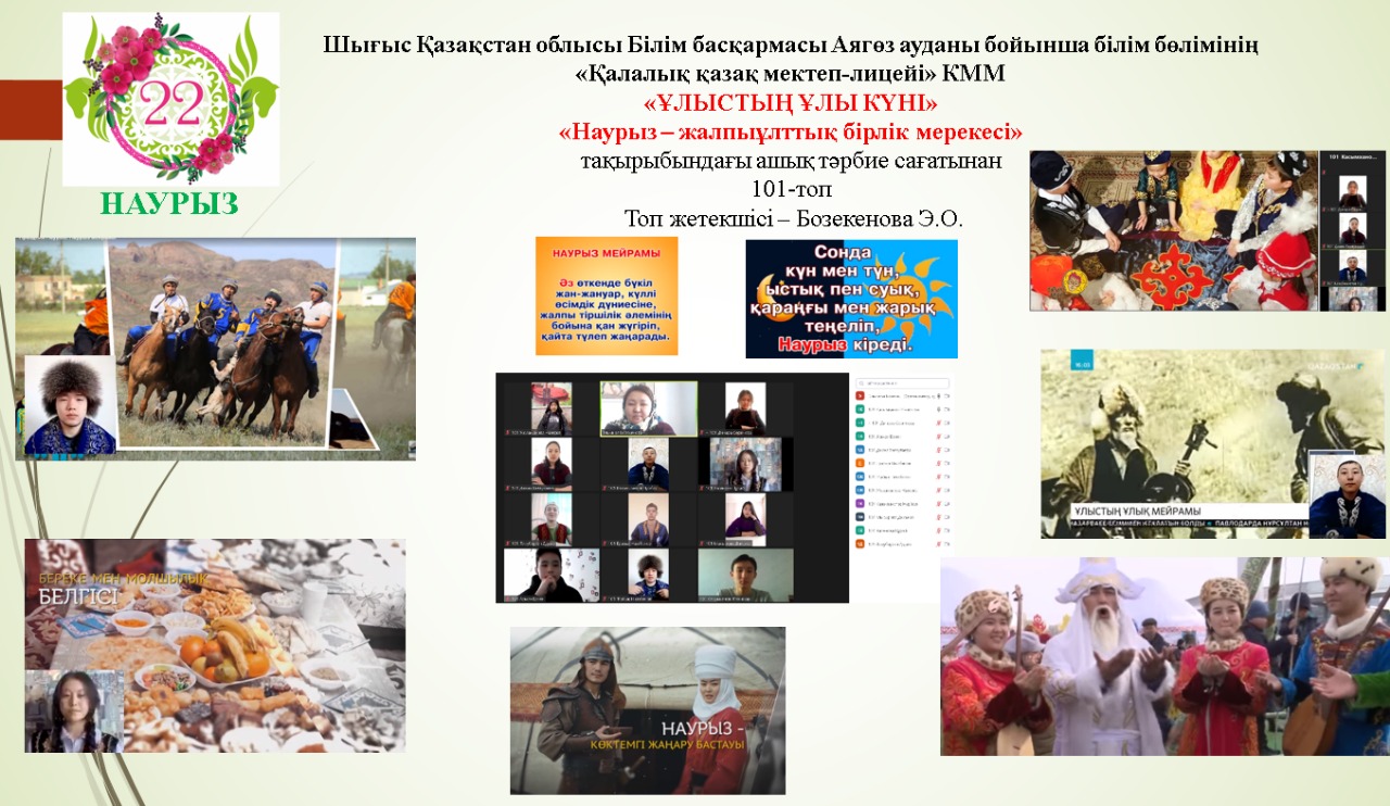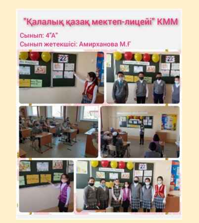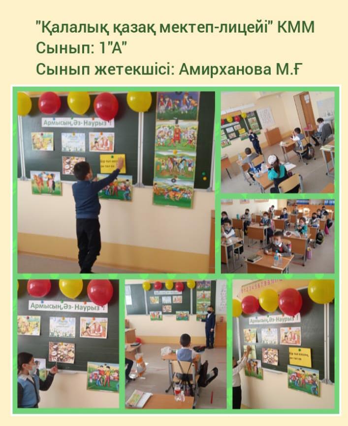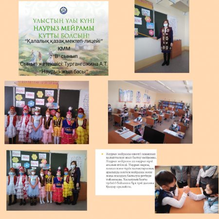 «Қалалық қазақ мектеп-лицейі»КММ-де «Наурыз-2021» іс-шаралары атап өтілді. 10 күнге арналып, әр күнге атау беріліп, төмендегідей жұмыстар жүргізілді. Бірінші күні «Көрісу күні» бастауыш сынып оқушылары қазақтың ұлттық мейрамы «Наурыз» туралы бейнероликтер шеруін жасады. Кітапханада қазақ халқының ру атауларына қатысты тәрбие сағаты жүргізілді. Наурыз мерекесіне арналған «Қуыршақ» театрының кезекті қойылымы қойылды.Жетекшісі - А.Лебаева. Көркем еңбек пәні мұғалімдері ұлттық қол өнер бұйымдарынан көрме ұйымдастырды. «Қайырымдылық жасасаң, қайырымын өзің көресің» атты қайырымдылық марафоны өткізілді. Онда әлеуметтік жағдайы төмен отбасыларға мектеп-лицей ата-аналары демеушілік көмек көрсетіліп, қайырымдылық танытты. «Таза табиғат акциясына әр жанұядан 1 ағаш» челленджі ұйымдастырылды. Дене шынықтыру пәні мұғалімдері "Шымырлық күні" ұлттық спорт ойын түрлерінен жарыстар өткізді. Ал айтыс өнерінің жойылып бара жатқан «Бәдік айтыс», «Жұмбақ айтыс», «Салт айтыс», «Өтірік айтыс» түрлерін 5-6 сынып жетекшілері оқушыларына насихаттады. Барлық сыныптарда Ұлыстың ұлы күніне арналған тәрбие сағаттары өткізілді. Ұлыс оң болсын, ақ мол болсын!