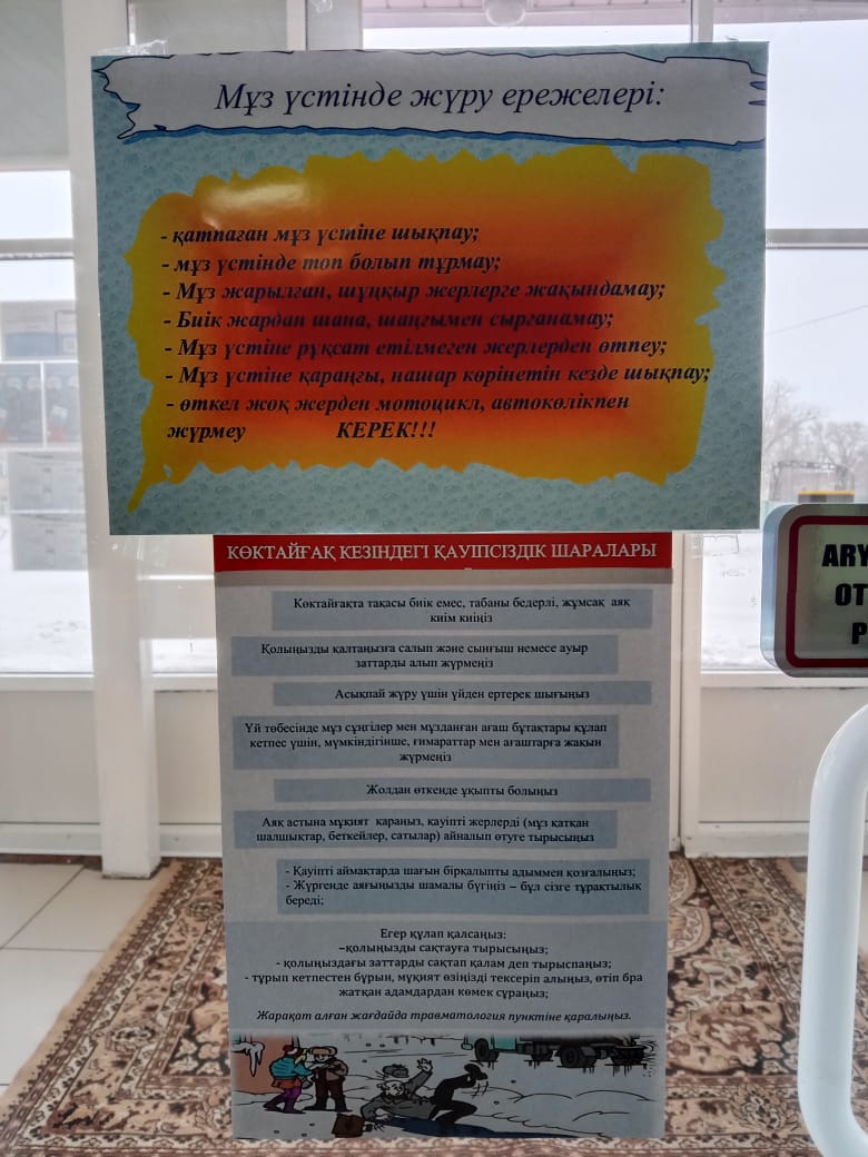 Азаматтардың соның ішінде балалардың қауіпсіздігін қамтамасыз ету мақсатында қауіпсіздік бұрыштарына "Мұздағы қауіпсіздік" тақырыбында жадынама плакаттар ілді.