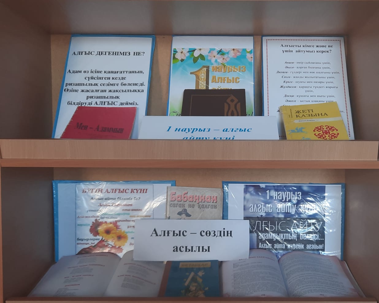 1 наурыз Алғыс айту күніне орай оқушылардың үлкен-кішіге сүйіспеншілігін , сыпайылық сезімін арттыру мақсатымен "Алғыс - сөздің асылы" кітап көрмесі қойылды