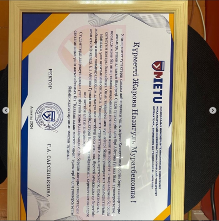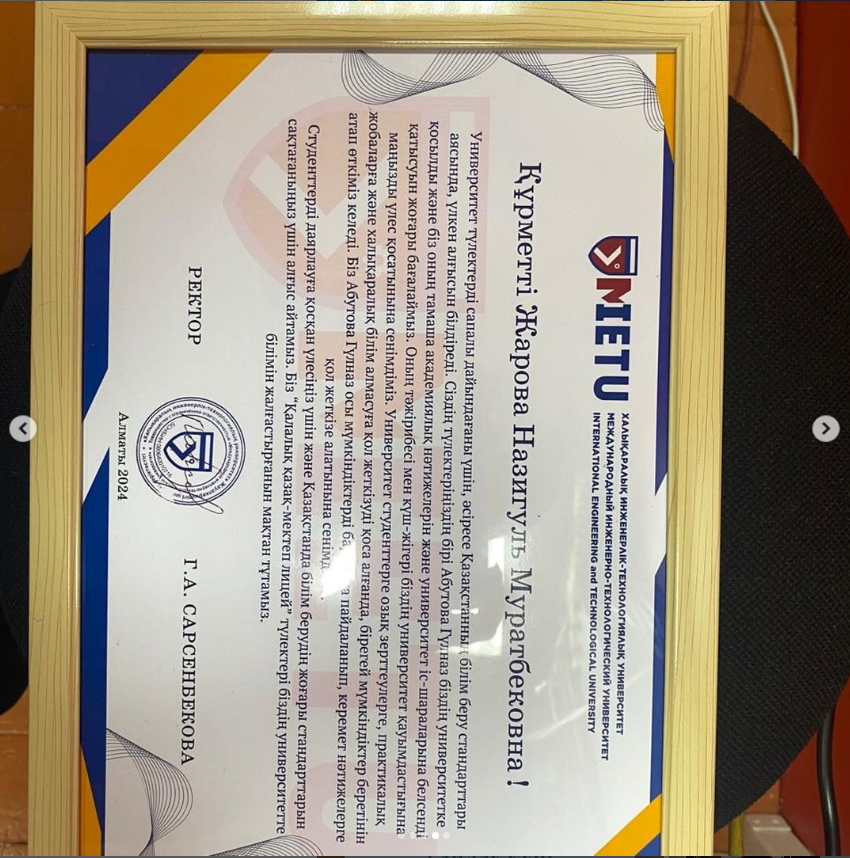 Кездесу соңында Гүлназға өзі оқып жатқан оқу орынынан мектеп басшысы Жарова Назигуль Муратбековнаға арнайы берілген алғыс хаты табысталды.