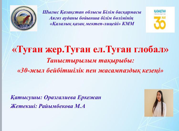 Қазақстан Республикасы Тәуелсіздігінің 30 жылдығына арналып «Рухани жаңғыру бағдарламасы» бойынша Шығыс Қазақстан облысының білім басқармасының Дарындылық пен ғылыми-әдістемелік «Дарын орталығы» Сәрсен Аманжолов атындағы университетімен бірлесе отырып, онлайн режимде өткізген пән олимпиадасында мектебіміздің 11-сынып оқушысы ОРАЗҒАЛИЕВА ЕРКЕЖАН Гран-при иегері атанып, С.Аманжолов атындағы университет грантын жеңіп алды.