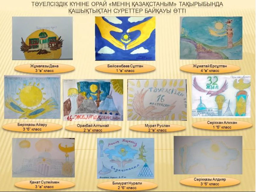 15.12.2023 ж. 1-4 сынып оқушылары арасында Тәуелсіздік күніне орай "Менің Қазақстаным" тақырыбында қашықтықтан суреттер байқауы өтті